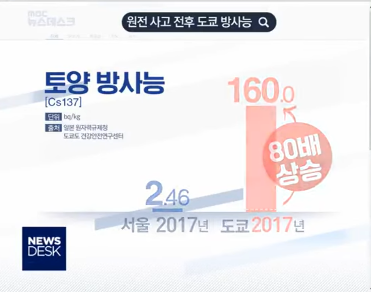 원전사고 전후 도쿄 방사능. 토양방사능 Cs137 서울이 2017년에 2.46베크럴이나 같은해 도쿄는 160베크럴로 80배임을 나타내는 그래프(출처: 일본원자력규제청, 도쿄도 건강안전연구센터)