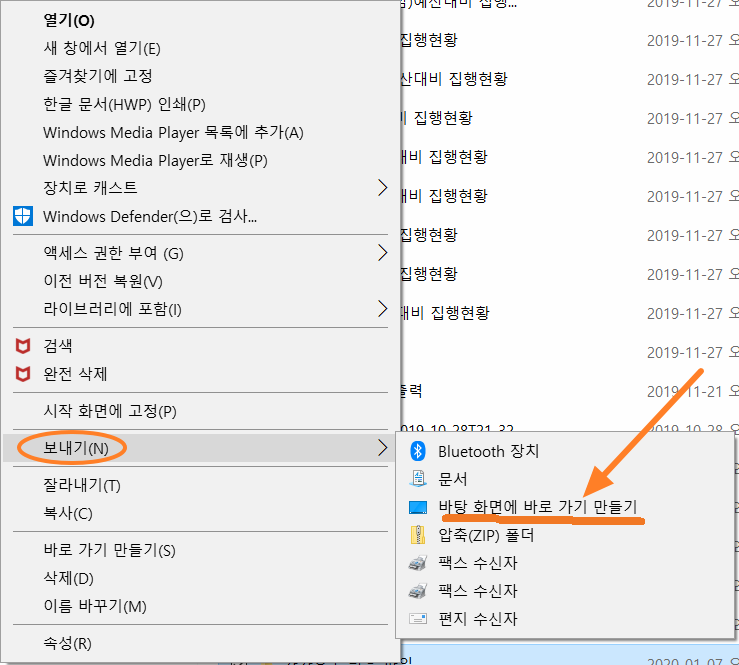 폴더 위에서 마우스 오른쪽 클릭하여 '보내기' 메뉴에 마우스 커서를 위치시키면 오른쪽 아래로 실행할 수 있는 부가적인 메뉴가 펼쳐지고 그 메뉴 가운데에서 '바탕 화면에 바로 가기 만들기' 메뉴에 커서를 이동시켜 마우스로 클릭하여 선택하면 바탕 화면에 바로 가기 아이콘이 만들어진다.