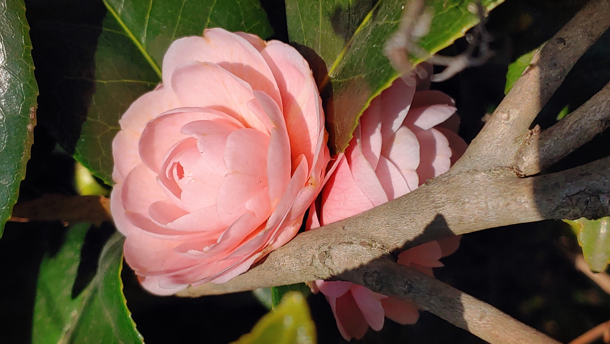 덤불 속 숨었던 동백꽃이 수줍은 얼굴이다.