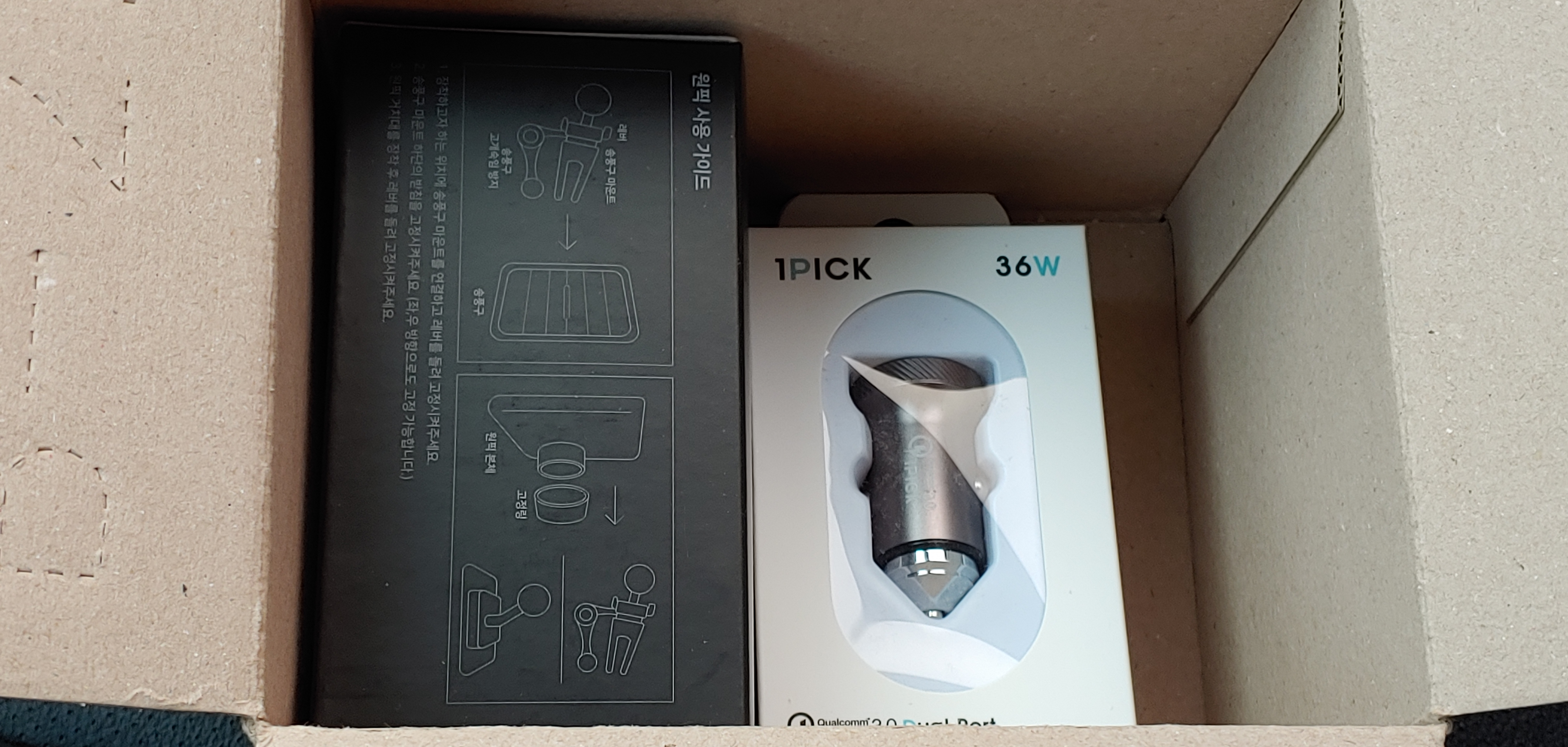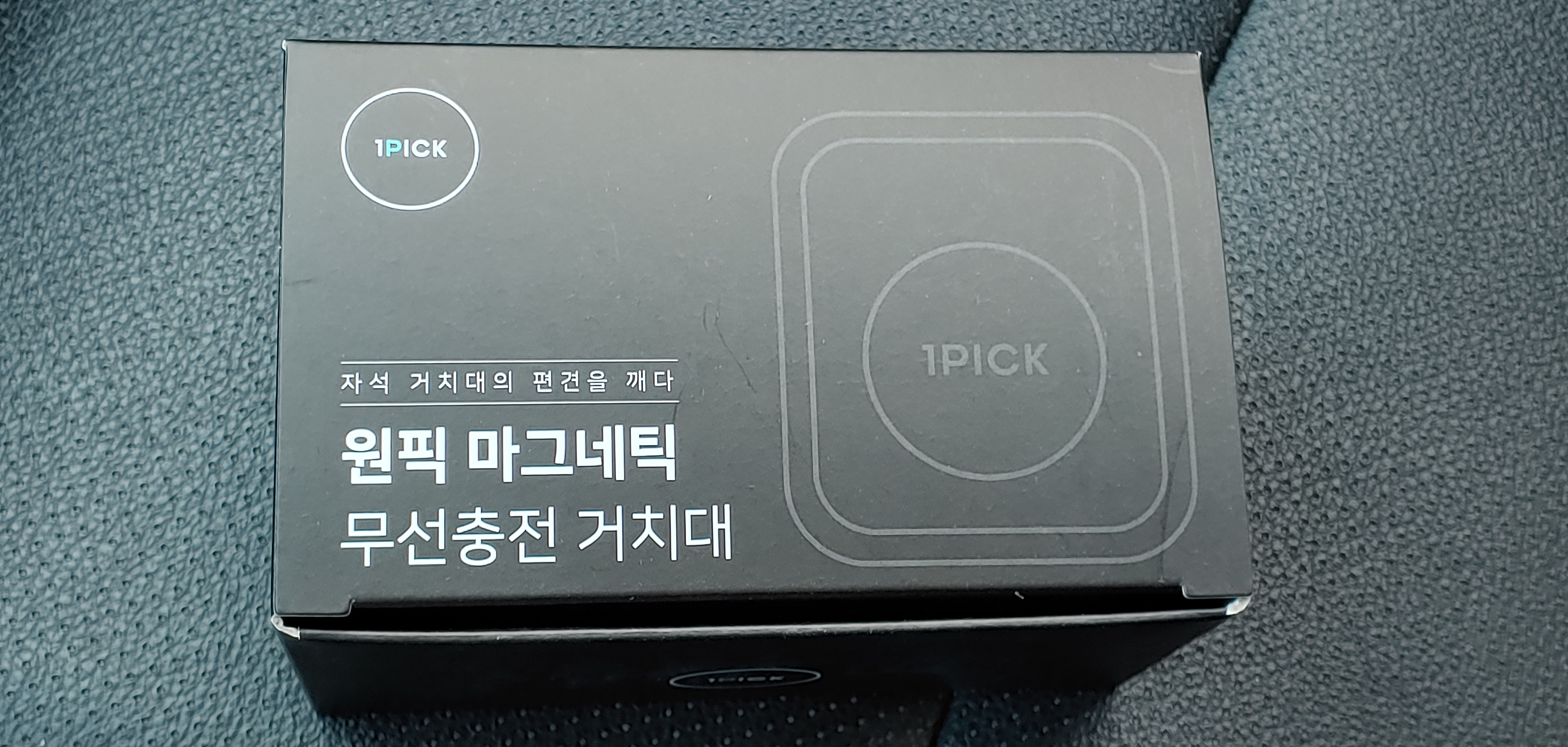 검은 박스가 본품인 원픽 마그네틱 무선 충전 거치대입니다.
