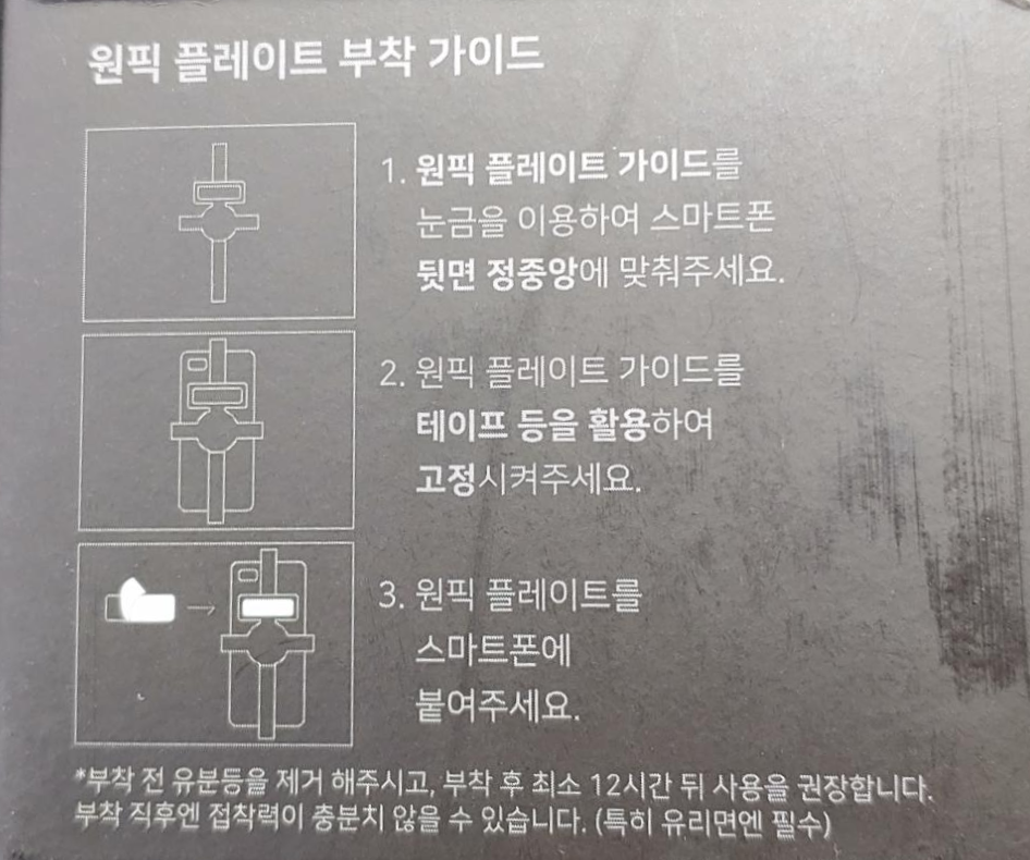 플레이트 고정용 가이드가 제공되었지만, 지문인식 스미트폰은 지문인식 부분을 완벽하게 막아버리는 위치여서 당황스러웠습니다.