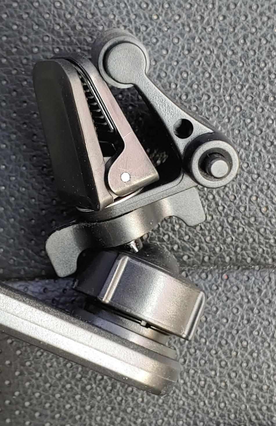 원픽 마그네틱 무선충전 거치대를 차량 에어컨 통풍구에 물려서 고정하는 부분으로 집게를 벌여 놓은 모습입니다.