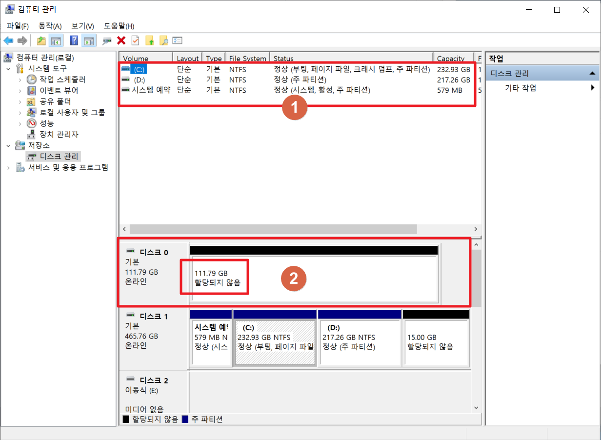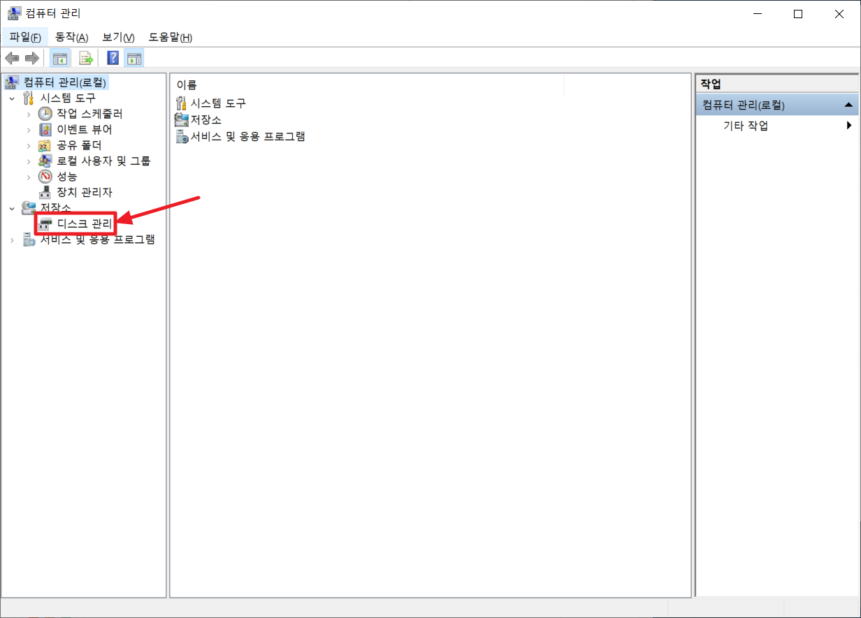 컴퓨터 관리 화면 왼쪽 창 부분에서 저장소의 디스크 관리 메뉴를 클릭하면 오른쪽 창에 디스크 장치들이 보입니다.