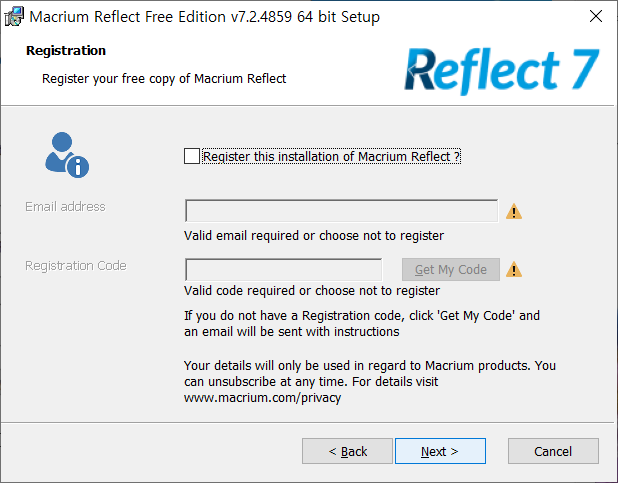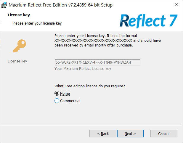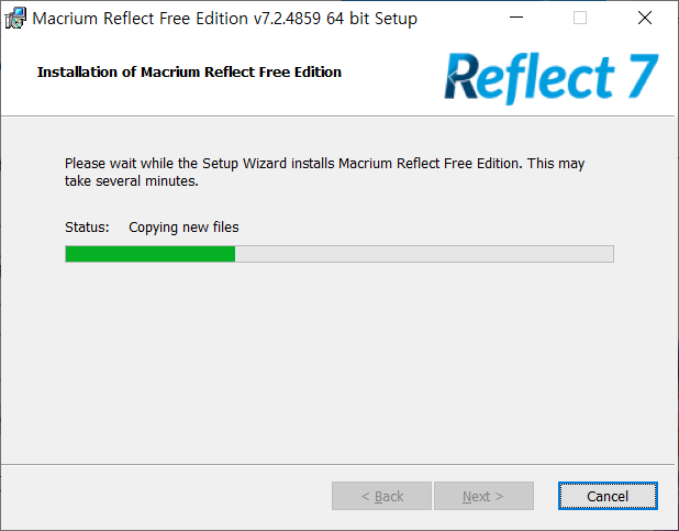 매크리엄 리플렉트 무료 버전 7.2 설치 화면입니다.