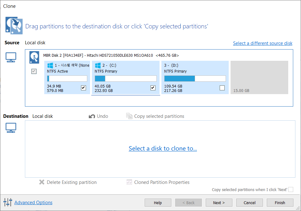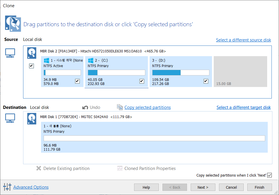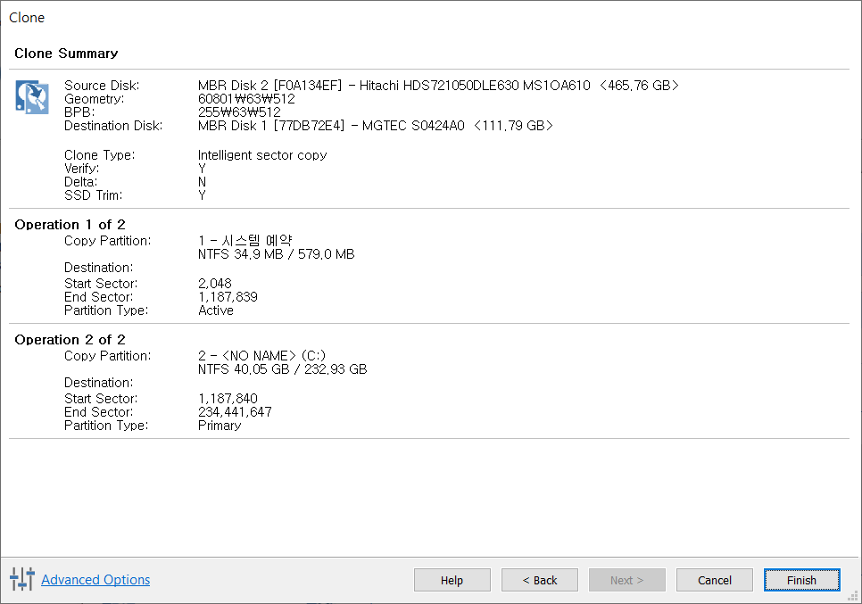 원본 드라이브나 새로 장착한 대상 드라이브나 잘못 선택을 방지하기 위해 두 번 세 번 확인하는 친절한 프로그램이네요.