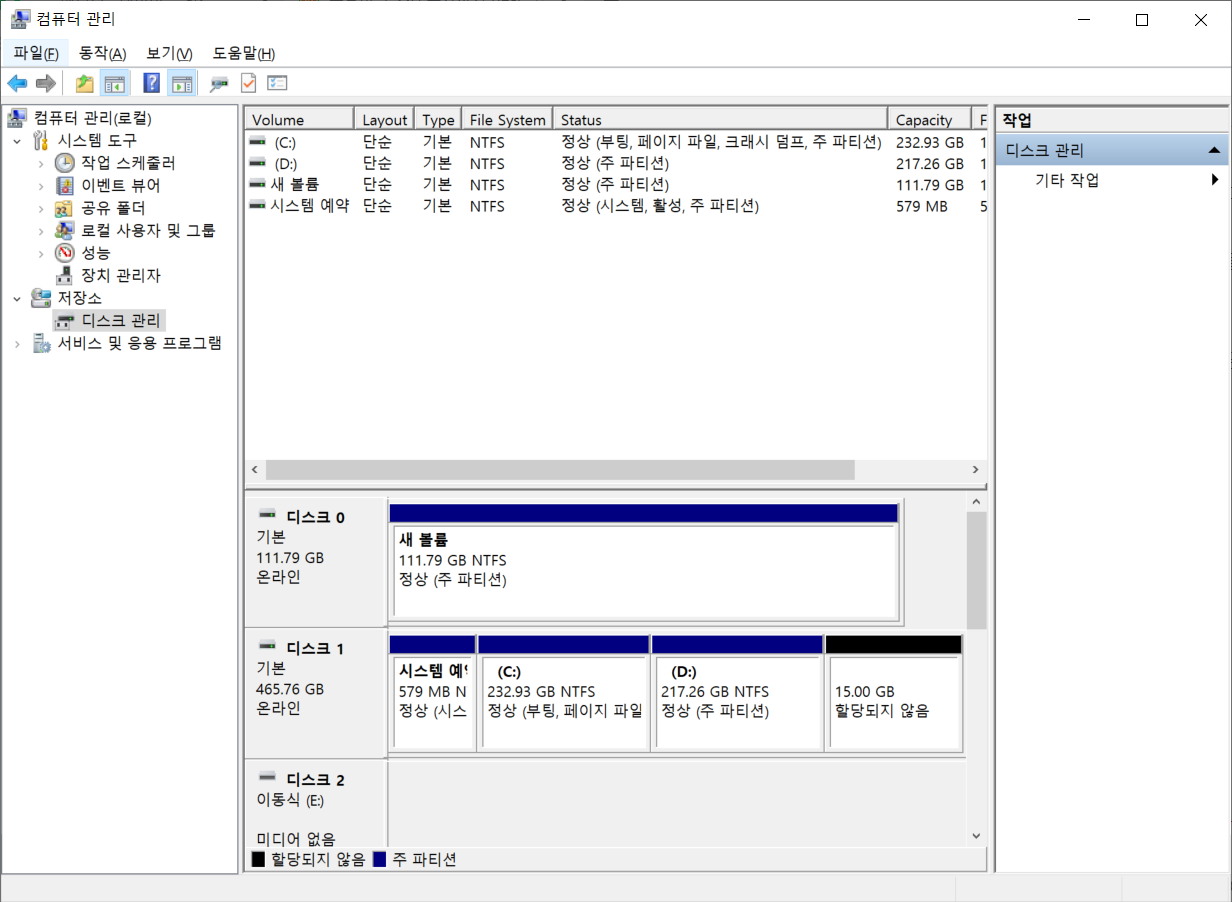 새롭게 장착한 SSD가 디스크 0으로 잡혀 있습니다.