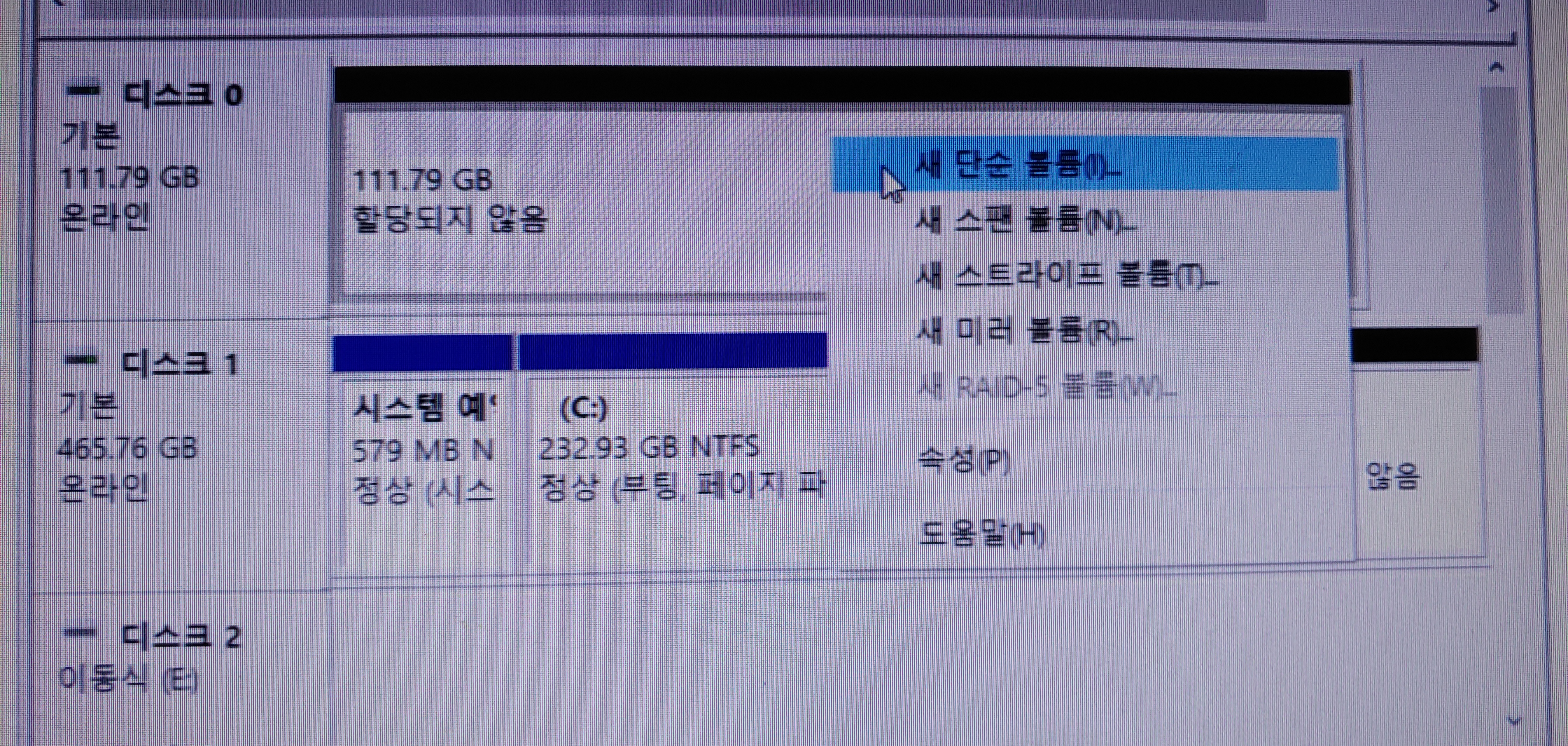 새롭게 장착한 저장장치 위에 마우스 커서를 놓은 상태에서 오른쪽 클릭하여 '새 단순 볼륨'을 선택합니다.
