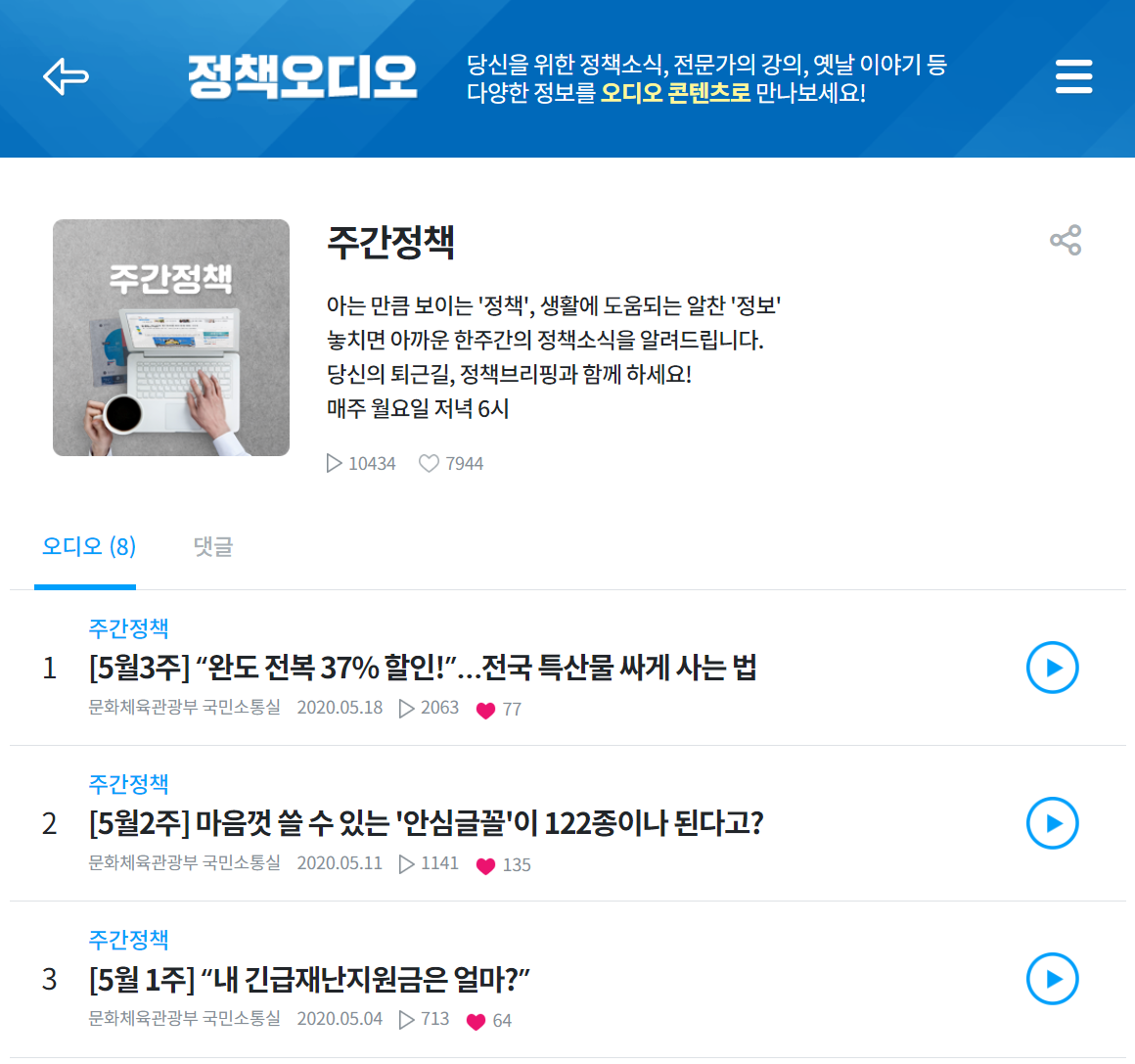 | 대한민국 정책포털 정책오디오를 듣다. (24) | 2020.04.23 |