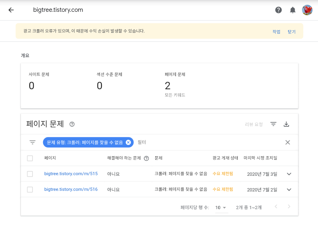 엊그제도 광고 크롤러 오류 메시지가 보였는데, 전에 했던 것처럼 그냥 무심하게 지나쳤습니다.