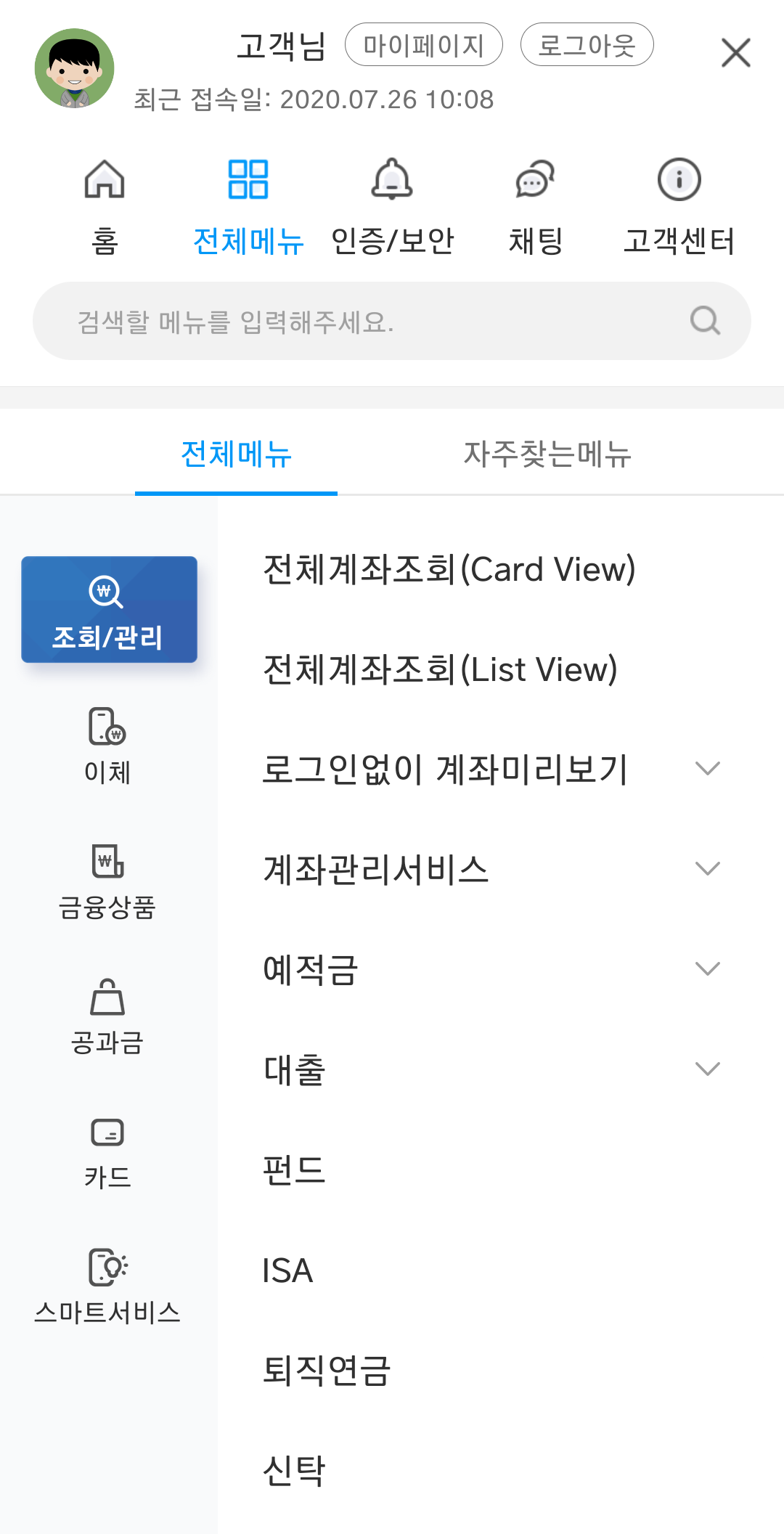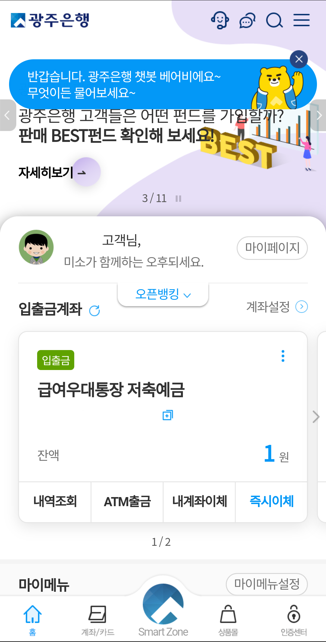 스마트폰에서 광주은행 앱을 실행하고 로그인을 하면 보여지는 첫 화면의 모습입니다.