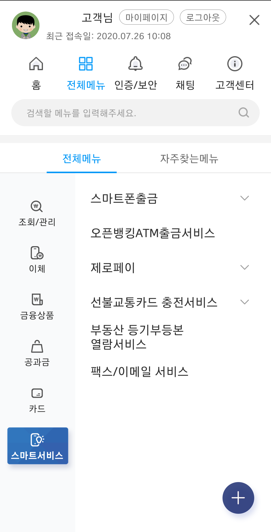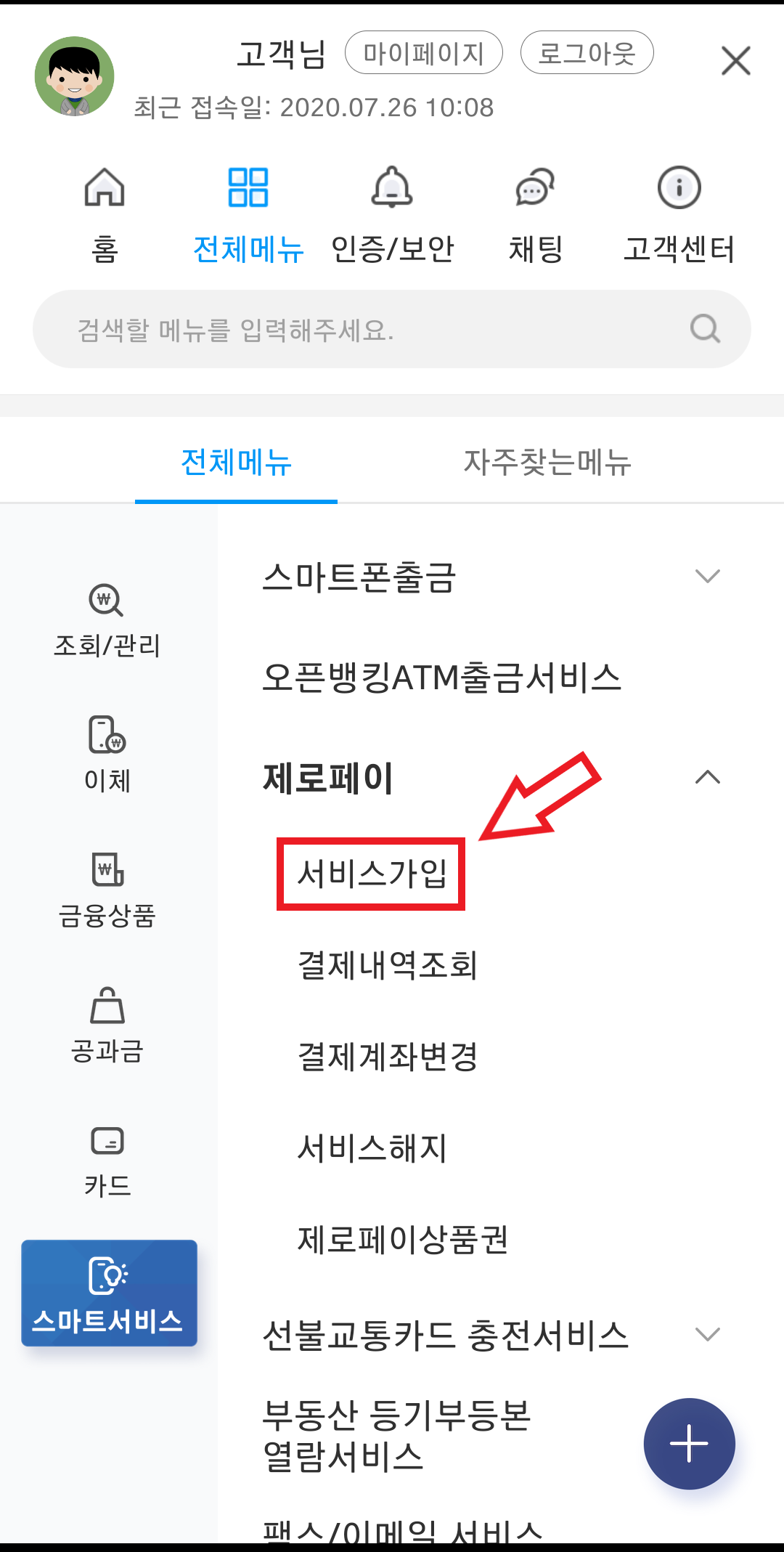 '스마트서비스' 메뉴를 선택하면 화면 오른쪽에 스마트서비스에 속한 메뉴가 보여지는데요. 제로페이 하위 메뉴 중 '서비스가입'을 선택하면 제로페이 서비스 가입페이지가 열립니다.