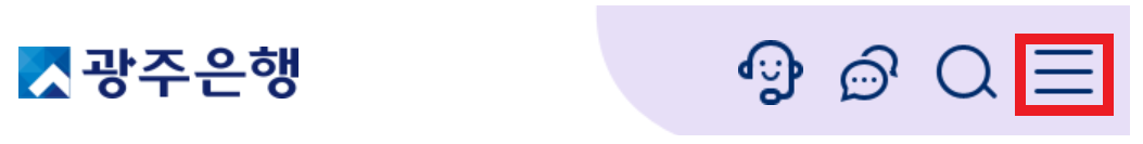 위 이미지는 광주은행 앱 우측상단의 메뉴를 선택하여 열린 화면으로, 왼쪽의 메뉴를 선택하면 오른쪽으로 선택된 메뉴에 속한 다양한 하위 메뉴가 나열되어 나옵니다.