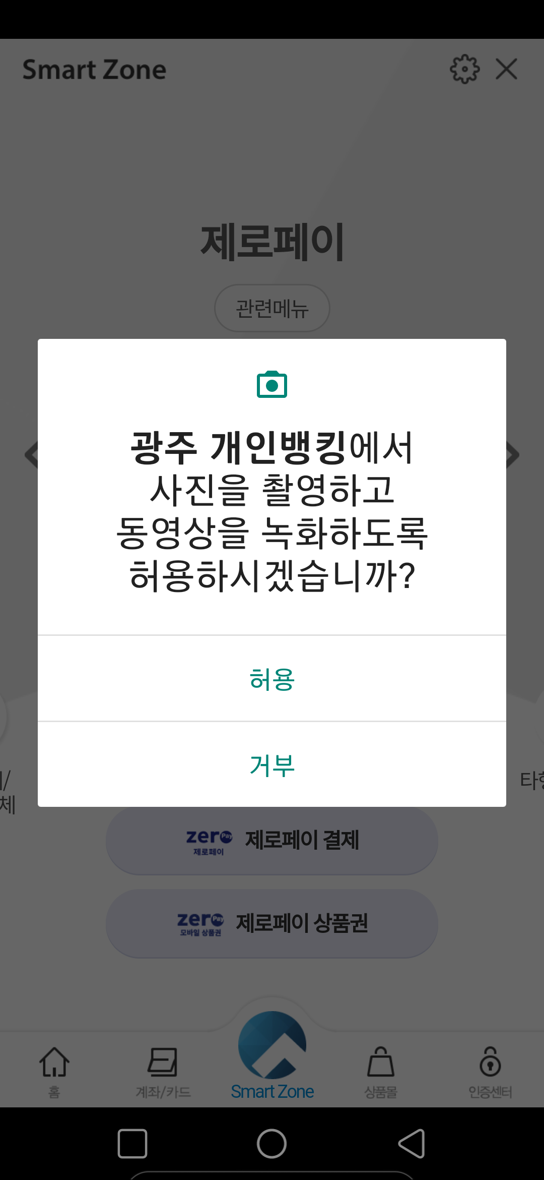 '광주 개인뱅킹에서 사진을 촬영하고 동영상을 녹화하도록 허용하시겠습니까?'라고 권한 허용을 요구하는데요.