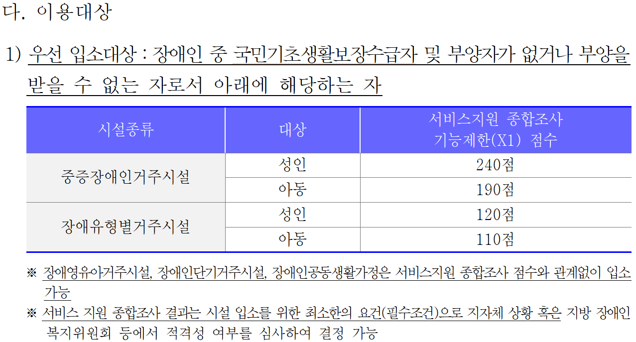 그리고 서비스지원 종합검사 기능제한(X1) 점수가 성인이 120점 이상이고 아동의 경우는 110점 이상인 사람은 장애유형별 거주시설에 입소가 가능합니다.