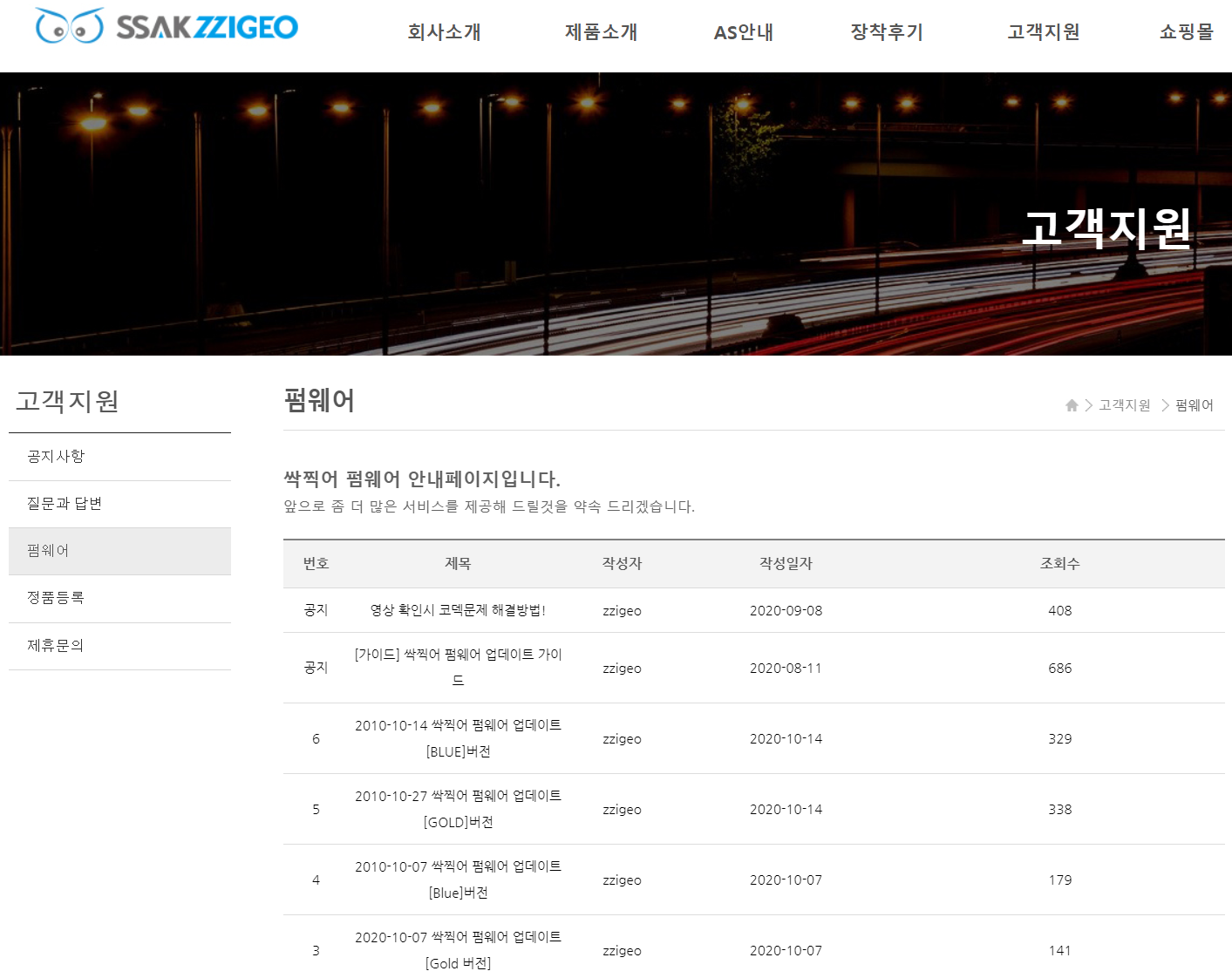 고객지원 메뉴에는 공지사항, 질문과 답변, 펌웨어, 정품등록, 제휴문의 등의 게시판이 마련되어 있습니다.