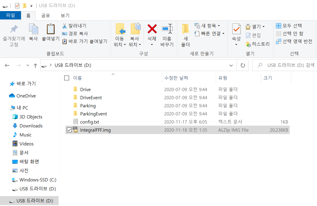 펌웨어 업데이트 사전 준비는 차량에 장착된 싹찍어 블랙박스에서 마이크로 SD 메모리 카드를 빼와 컴퓨터에 연결합니다.