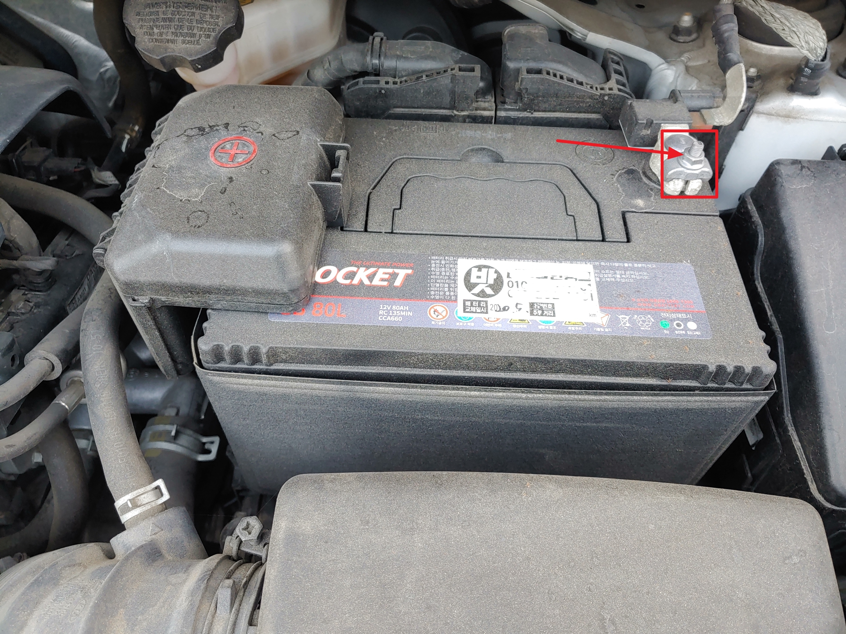 배터리를 탈거하기 위해서는 - 단자와 + 단자의 너트를 푼 후 배터리와 에어클리너 박스 사이의 좁은 틈에 있는 12mm(미리미터) 나사 한 개를 더 풀어야 합니다.