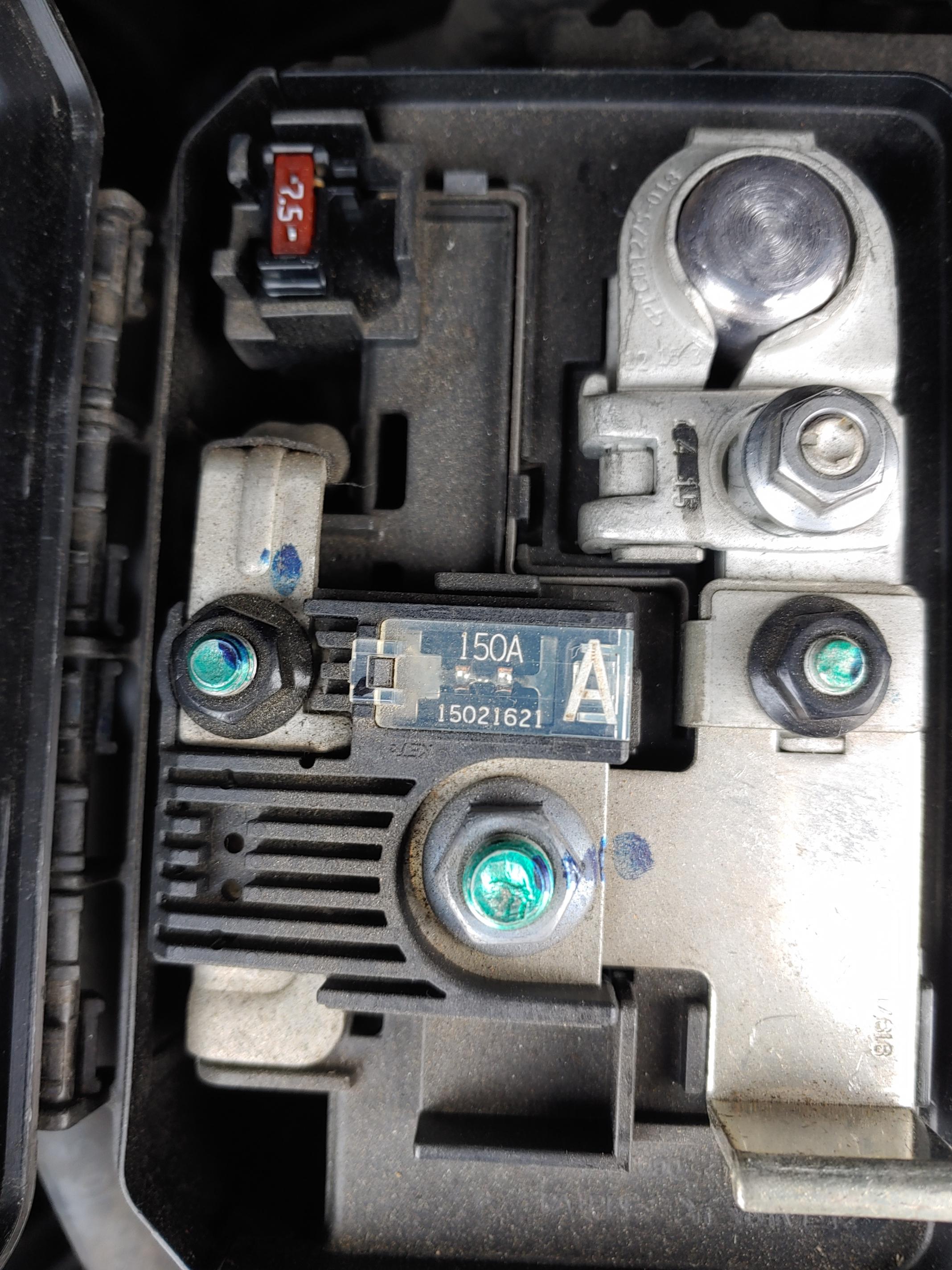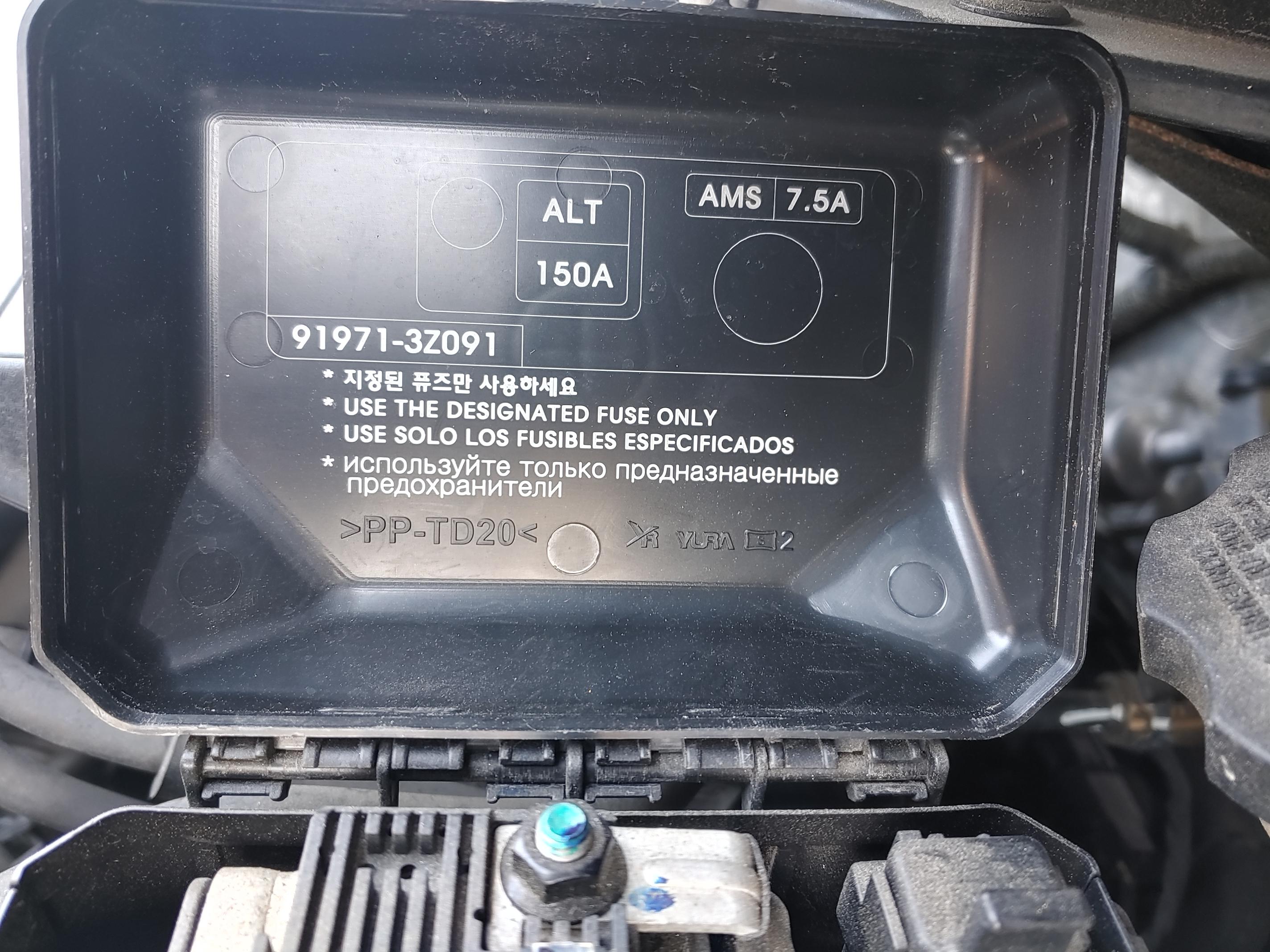 차량의 각종 전자기기를 보호하기 위해서 배터리 플러스극 단자에 150A(암페어)이상의 전류가 흐르지 못하도록 퓨즈가 설치되어 있습니다.
