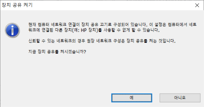 장치 공유 켜기 창에서 여러 장치에서 인쇄용 데이터를 받아서 사용할 계획이니 장치 공유를 할 수 있도록 예를 선택합니다.