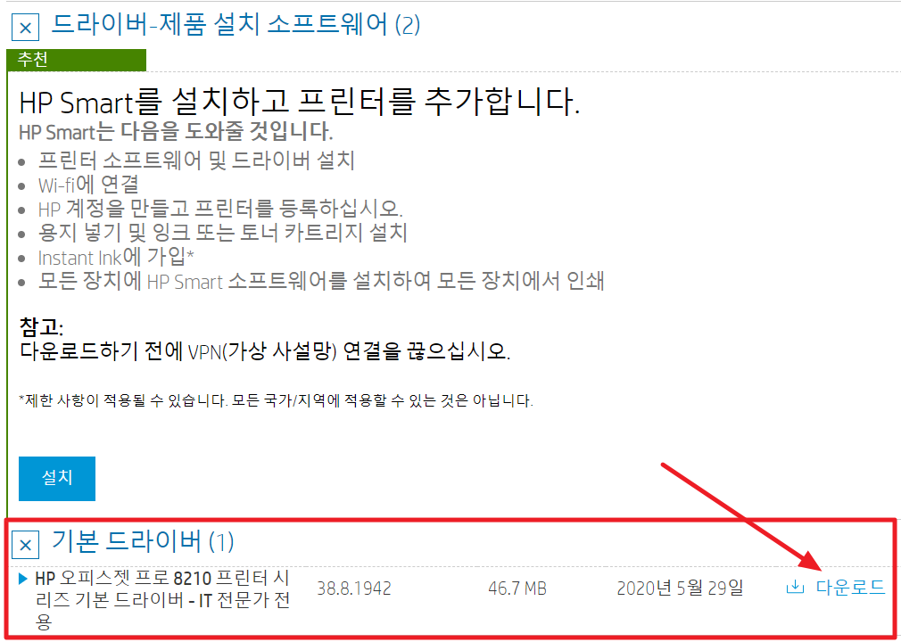 HP 오피스젯 프로 8210 프린터 시리즈 기본 드라이버를 찾아 다운로드 합니다.