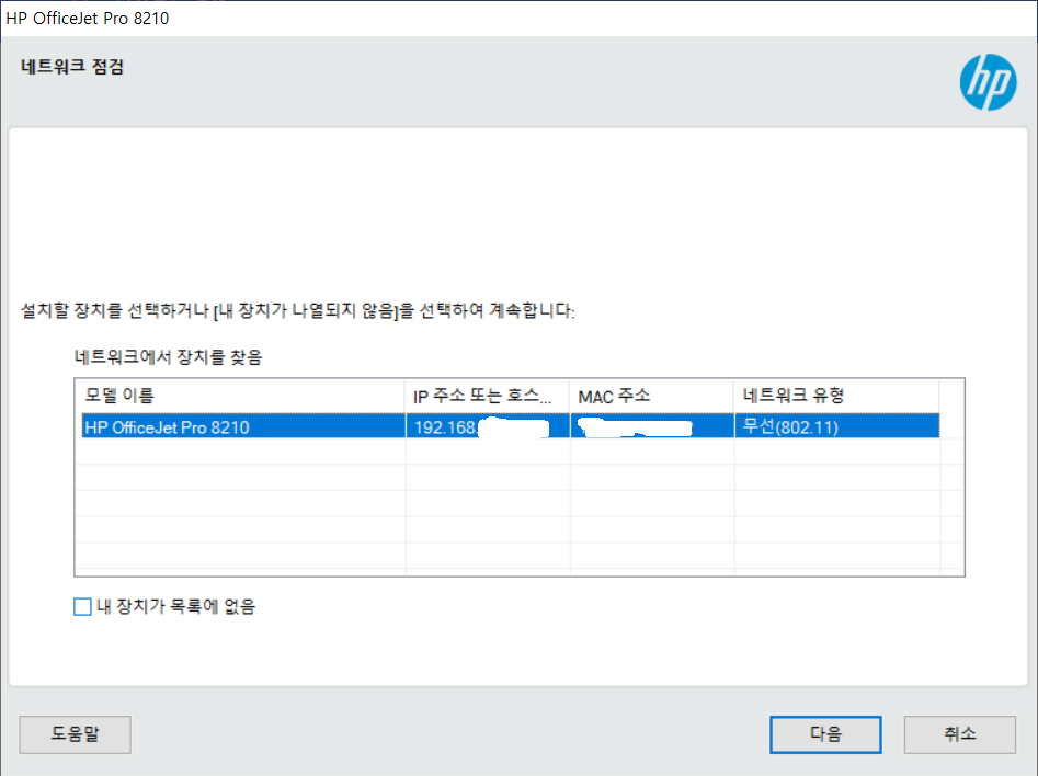 네트워크 점검을 하여 설치할 장치가 검색이 되고 장치의 IP주소와 MAC 주소, 네트워크 유형이 나타납니다.