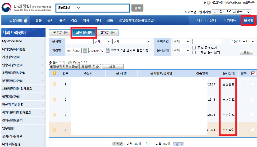 나라장터 로그인 후 보여지는 첫화면의 주메뉴의 맨 오른쪽 문서함을 선택하면 펼쳐지는 화면 중간에서 보낸 문서함 을 선택하면 아래에 송신이 완료된 상태를 확인가능합니다.