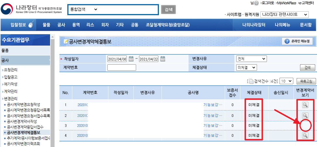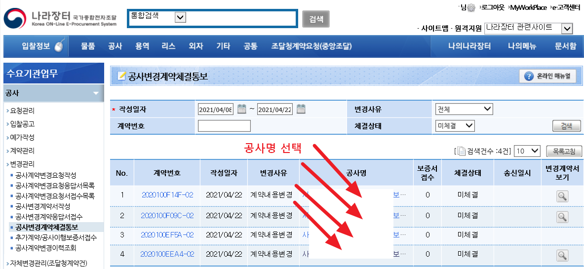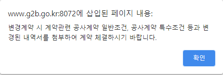 나라장터를 통해 공개입찰을 하고 선정된 공사업체들과 공사기간 연장이나 설계변경 등의 사유로 공사변경계약서를 체결해야하는 경우에도 나라장터를 통해 진행하게 됩니다.