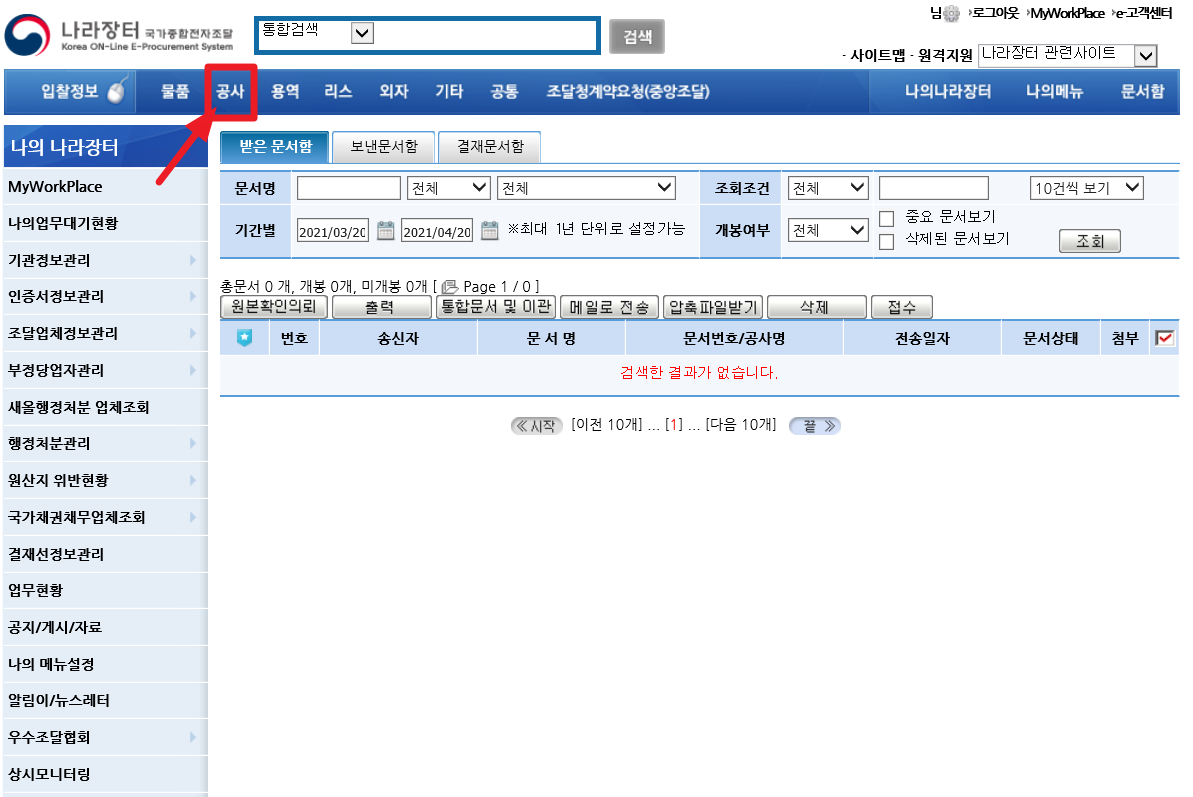 나라장터에 로그인 후 주메뉴에서 공사를 선택하면 화면 왼쪽으로 공사에 해당하는 메뉴가 펼쳐집니다.