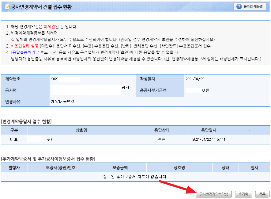 기존의 공사계약 내용을 선택하여 수정을 하여 송신하면 공사업체에서 변경내용을 확인하는 과정을 거쳐 응답을 하고 변경이 추가로 필요한 건설공제조합이나 전기공사공제조합 등에서 발급하는 증명서 등을 변경해 보내오는 내용을 확인하는 과정을 거처 공사변경계약서를 완성하여 통보하는 과정을 거치게 됩니다.