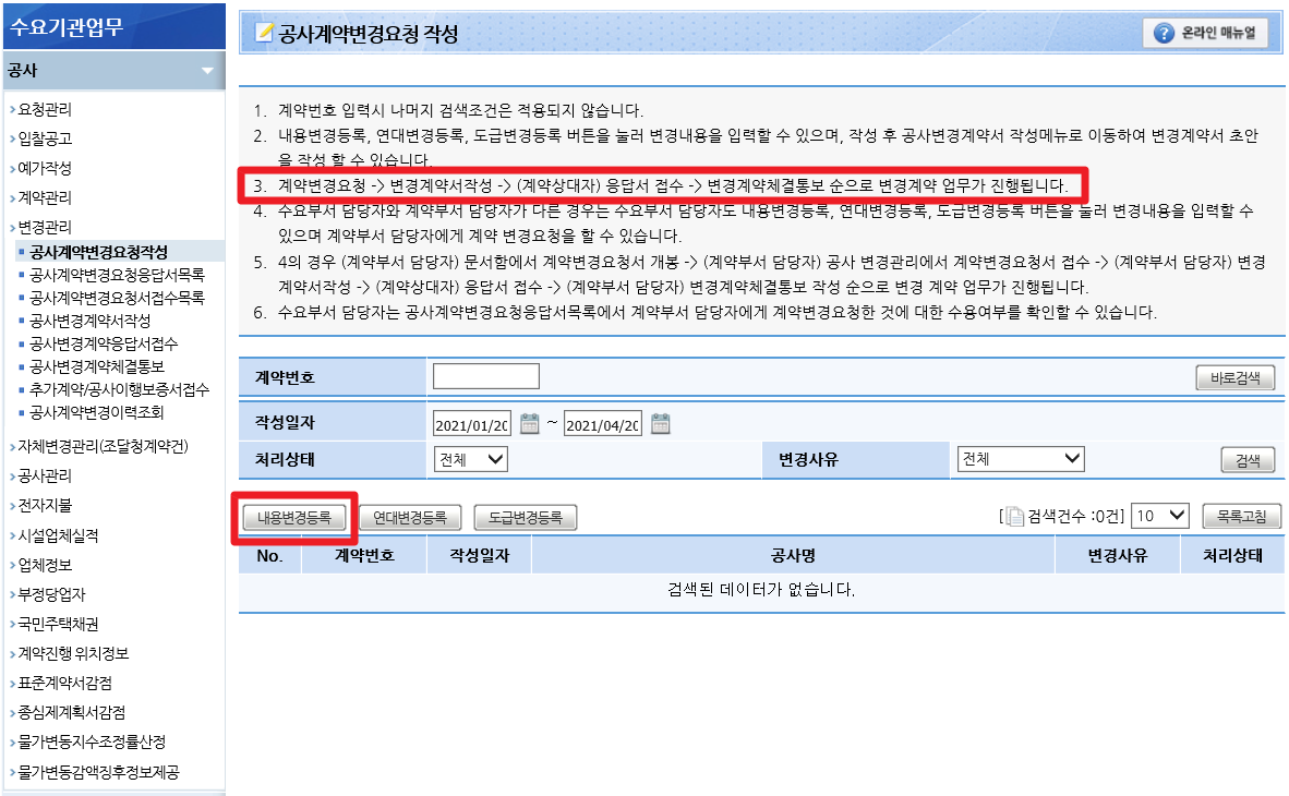 나중에 확연하게 알게 되었지만, '초안'을 보내달라는 말이 바로 '공사계약내용변경요청' 메뉴를 통해 작성된 내용을 초안이라고 하는 것이었습니다.