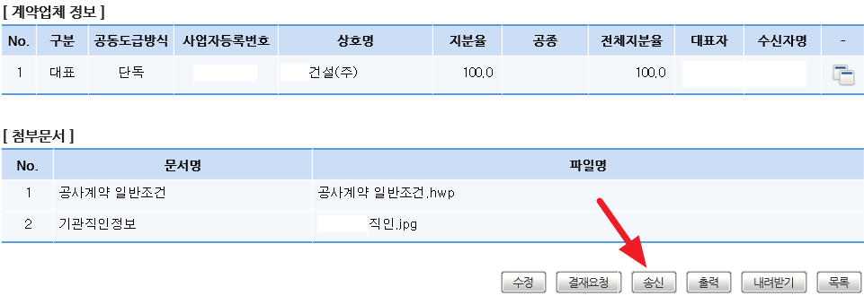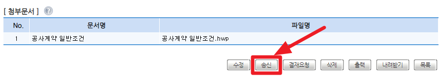 송신을 클릭하면 공사업체에게 작성한 공사변경계약서 초안이 전달됩니다.