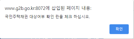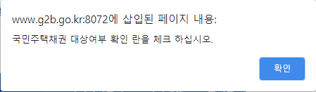 국민주택채권 대상여부 확인 네모칸을 체크하지 않으면 뜨는 확인창입니다.