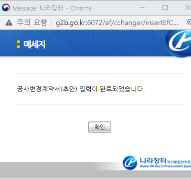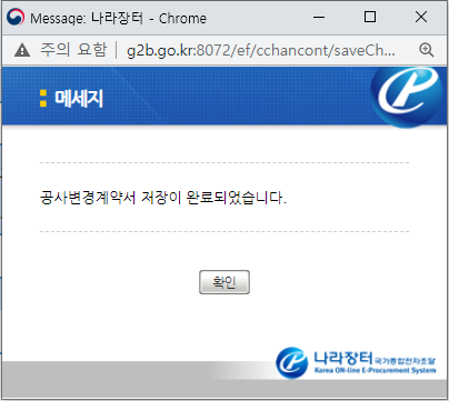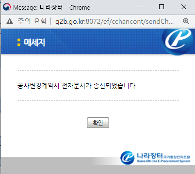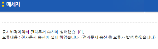 공사변경계약과 관련하여 문제되는 내용이 아님을 확인하여 다시 송신과정을 거쳐 인증서 암호를 입력하여 끝까지 진행할 수 있었습니다.
