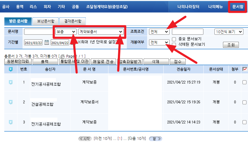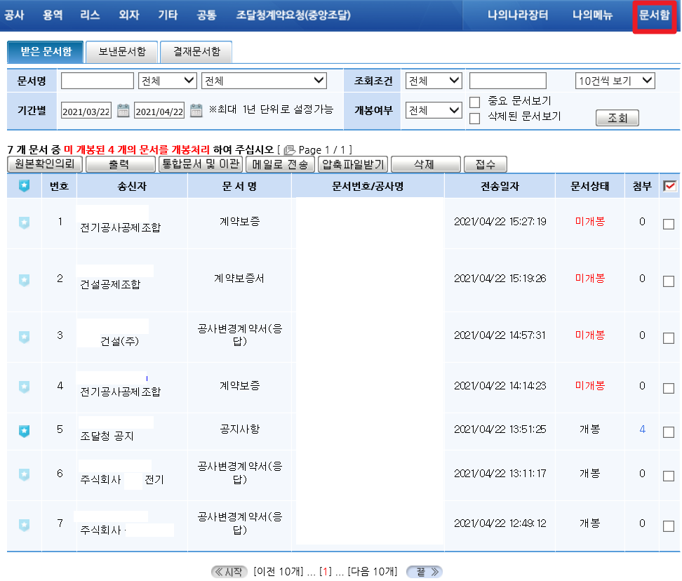 도착한 문서 중 이미 확인한 문서는 개봉으로 표시가 되고 아직 확인하지 않은 문서들은 미개봉으로 빨강색 글씨로 강조가 되어 있어 쉽게 확인이 가능합니다.
