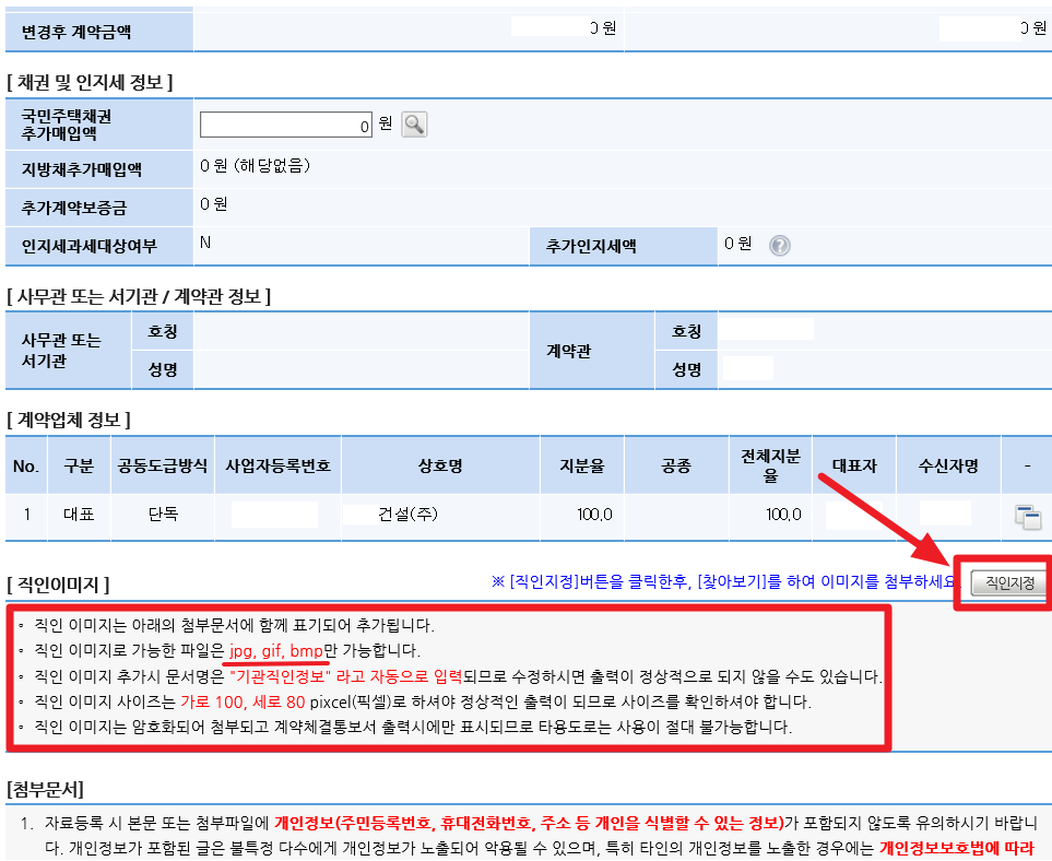 마지막으로 계약내용의 이상유무를 확인하고 문제가 없다면 직인지정 아이콘을 선택하여 직인 이미지를 첨부해줍니다.