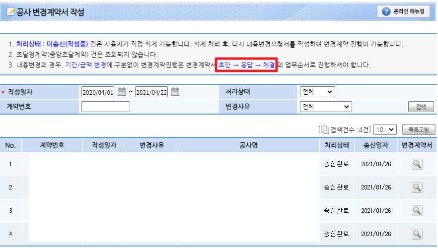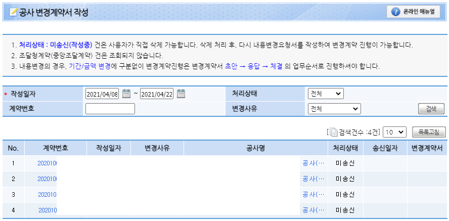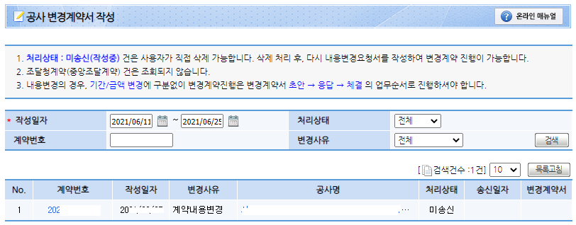 초안을 작성하기 전에 이전에 변경계약을 '공사변경계약서 작성' 화면에서도 찾을 수 있었는데요.