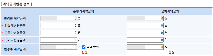 계약금액변경 정보 부분에서 금액을 확인하고 금액확인을 체크합니다.