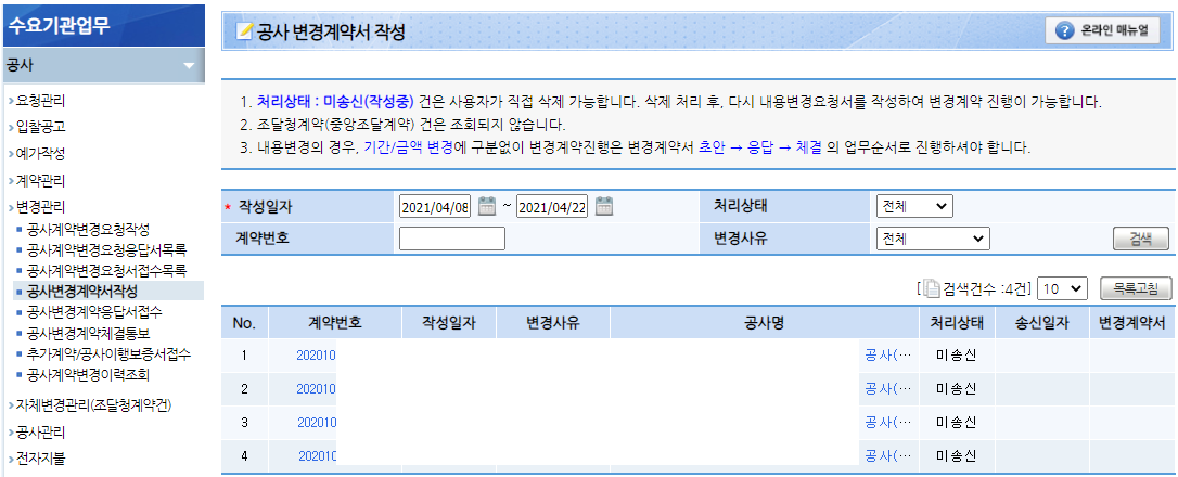 공사변경계약서 작성 메뉴에 들어가서 방금 작성한 기간만으로 작성일자를 조정하여 검색하면 검색결과에 미송신 상태로 검색이 됨을 확인할 수 있습니다.