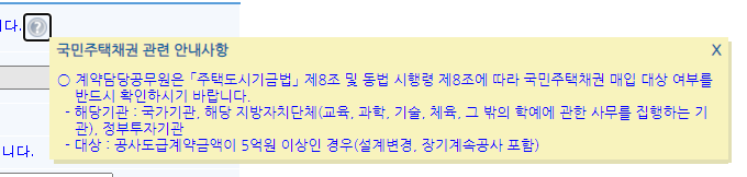 계약담당공무원은「주택도시기금법」제8조 및 동법 시행령 제8조에 따라 국민주택채권 매입 대상 여부를 반드시 확인하시기 바랍니다.