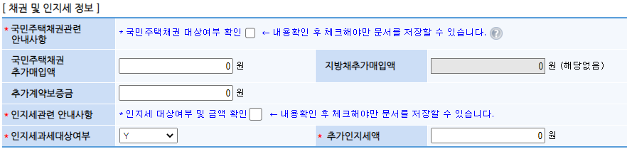 금액확인, 국민주택채권 대상 여부 확인, 인지세 대상여부 및 금액확인은 반드시 체크해야 저장이 가능하도록 설계되어 있습니다.