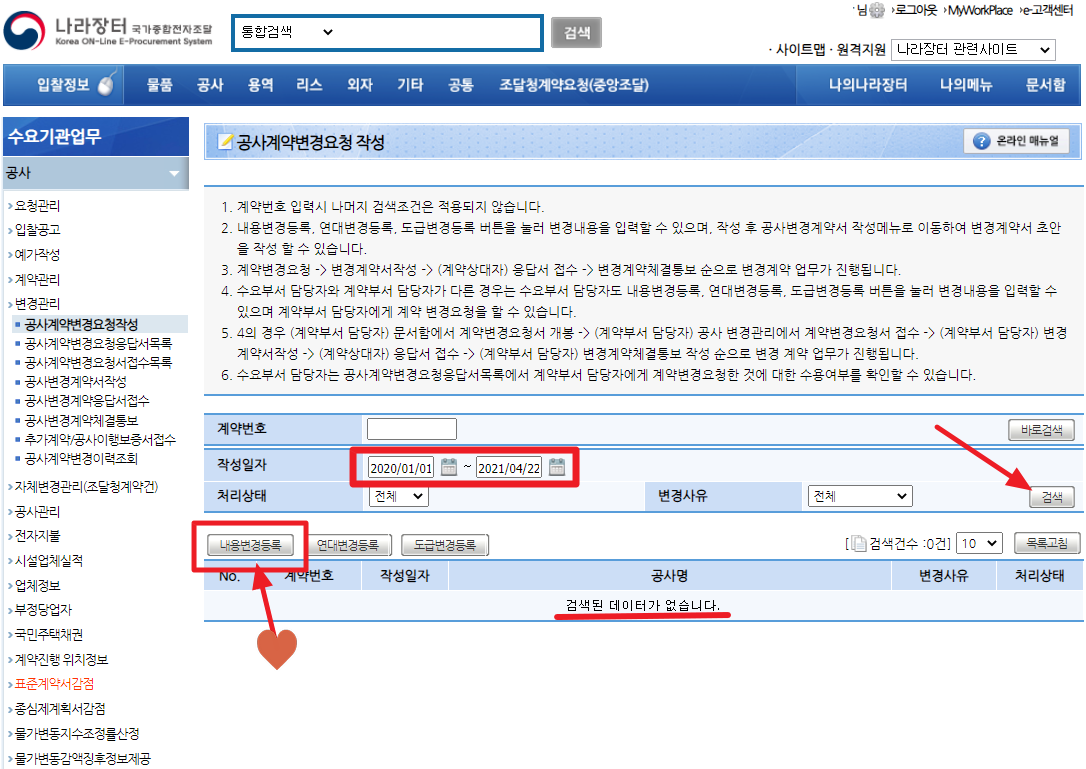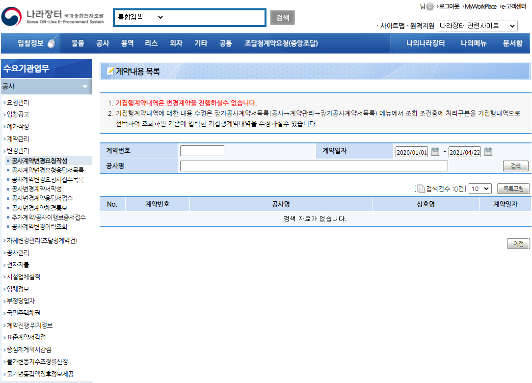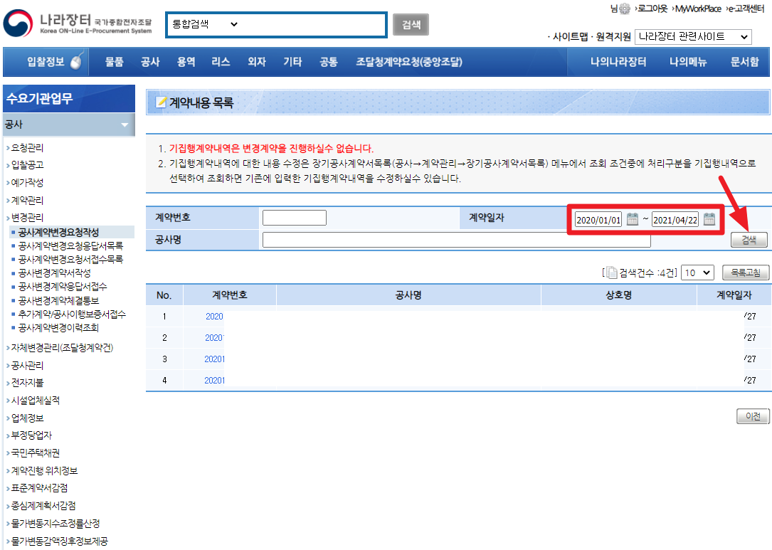 내용변경등록 화면에서 계약일자를 찾기 원하는 기간을 포함하는 날짜로 검색조건을 수정하여 검색하면 기존의 공사계약 내용을 확인할 수 있습니다.