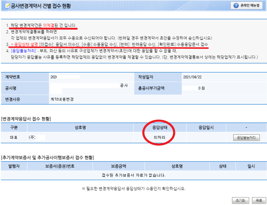 돋보기가 없는 데는 공사업체에서 공사변경계약서의 응답요청서를 아직 처리하지 않았기 때문입니다.