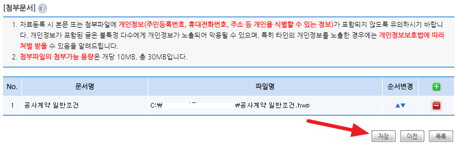 공사명을 선택하여 다시 열어 작성한 내용을 확인하는 과정을 거치도록 시스템이 만들어져 있습니다.
