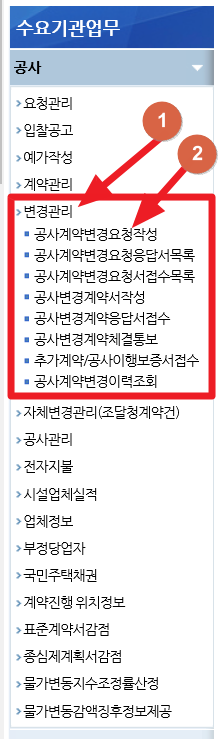 공사 > 변경관리 > 공사변경요청작성(초안) > 내용변경등록 > 계약일자 범위 지정 > 검색 > 기존 공사계약 목록 선택 > 공사계약서 수정(필요한 파일 첨부) > 송신 > 재수신 > 증명서 등 수신하여 확인 > 공사변경계약서 작성(직인 첨부) > 송신 > 수신확인