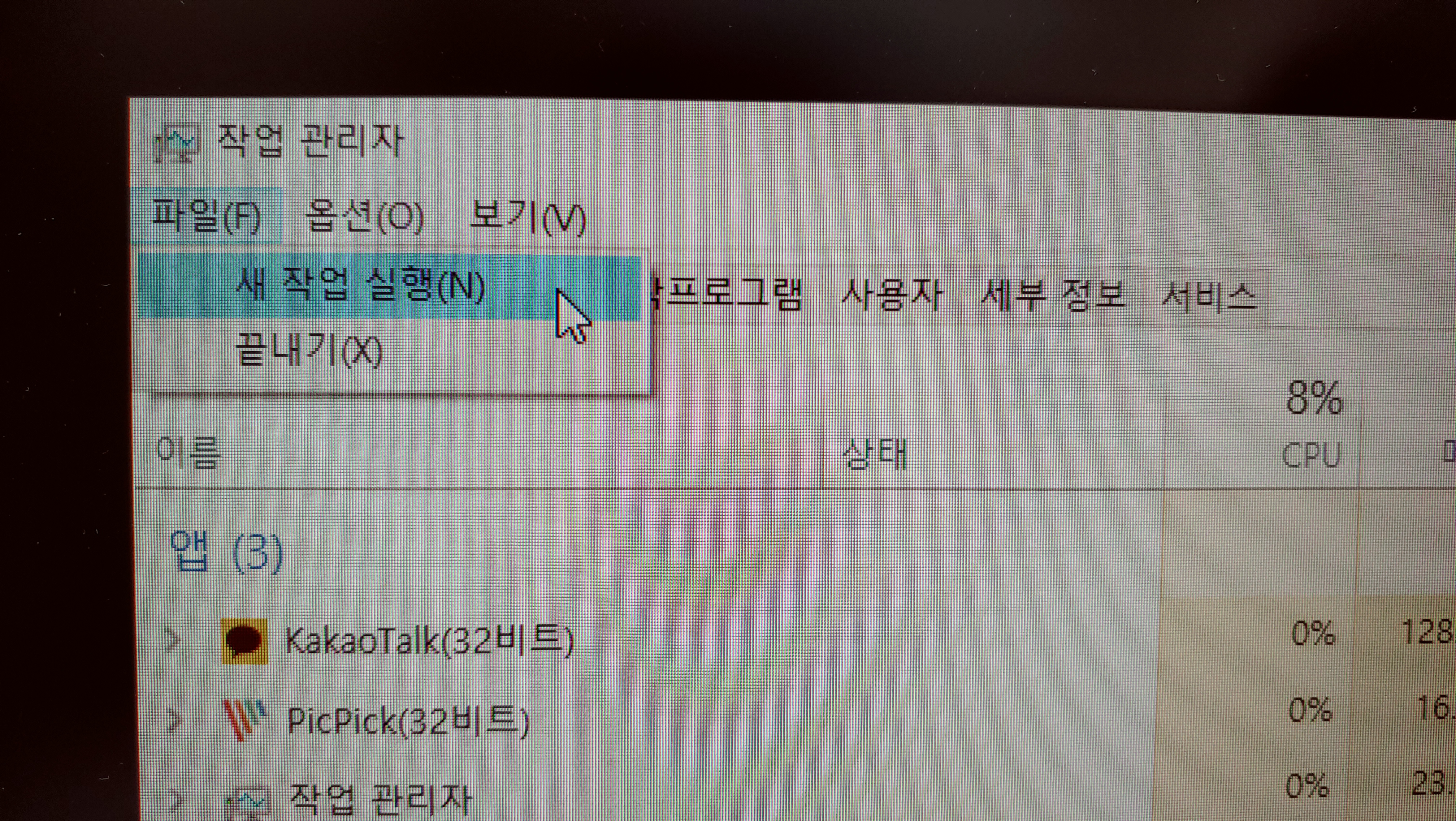 작업관리자 창에서 윗부분에 '파일'메뉴를 열어 새 작업 실행을 선택합니다.