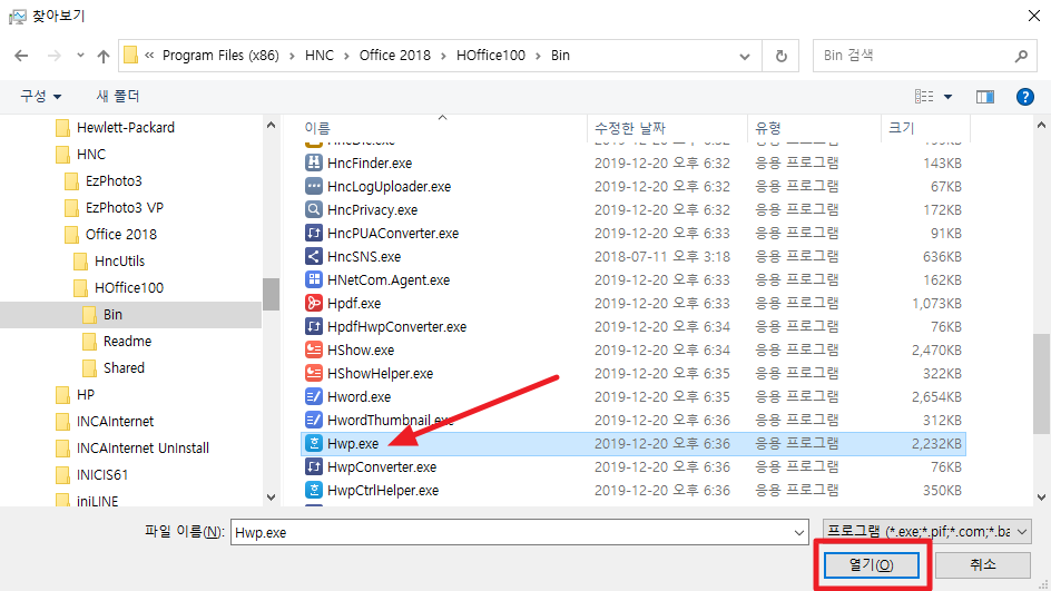 경로 순서는 C:₩Program Files(x86)₩HNC₩Office 2018₩HOffice100₩Bin₩Hwp.exe