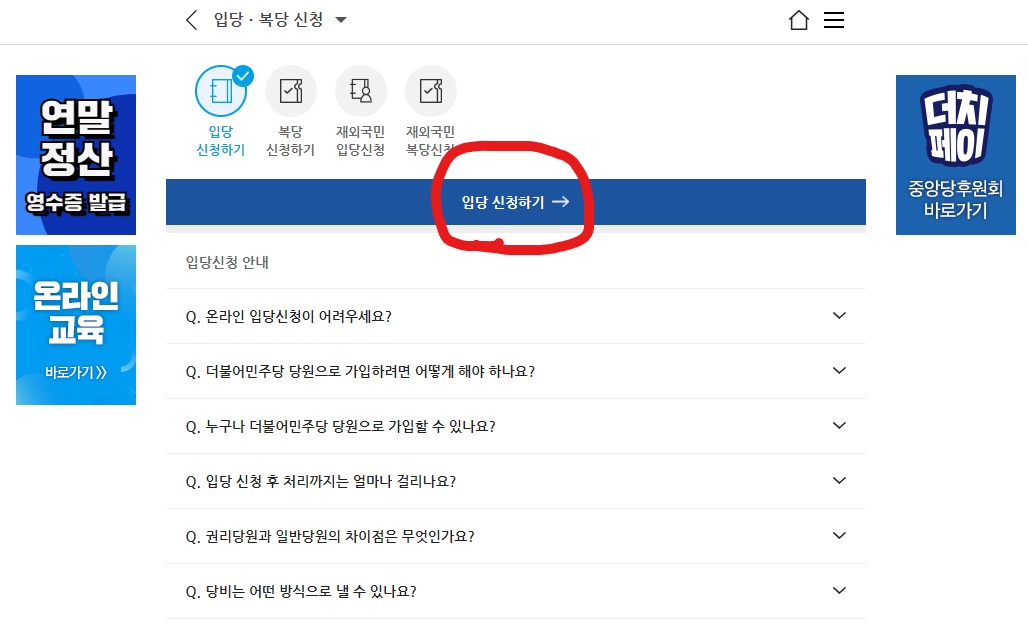 더불어민주당 홈페이지에 들어가서 입당신청하기를 선택합니다.