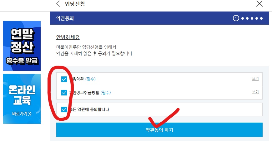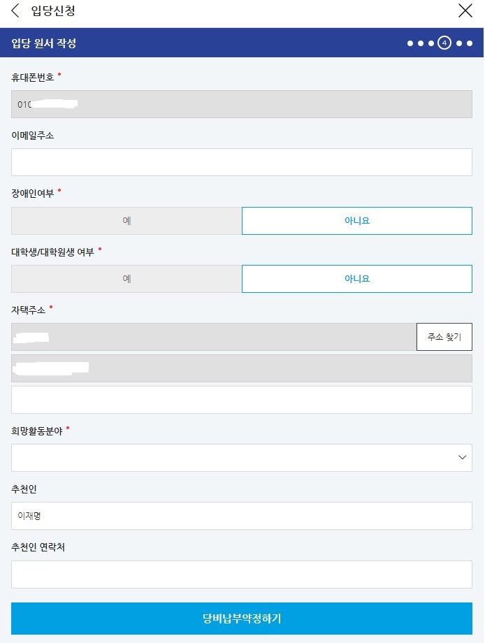 본인 확인 과정이 끝나면 입당 원서 작성을 하게 되는데요.