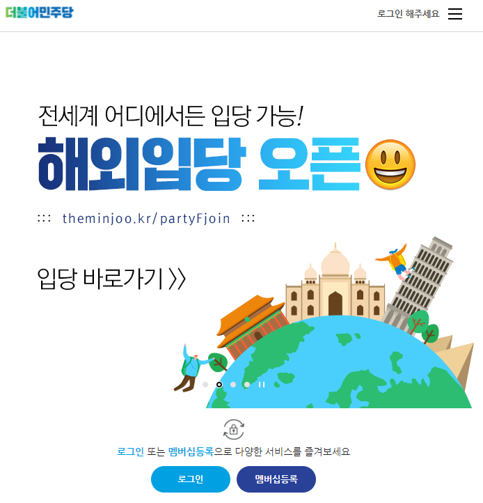 해외에서도 더불어민주당에 당원가입할 수 있도록 별도의 페이지로 안내 되어 있습니다.