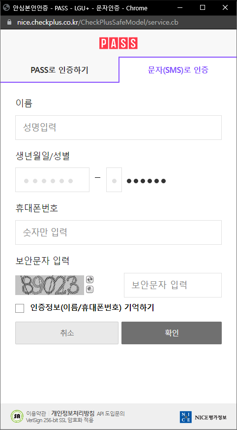 문자(SMS)로 인증 페이지에서 이름, 생년월일과 성별에 해당하는 번호를 입력 후 휴대폰 번호를 숫자만 입력합니다.
